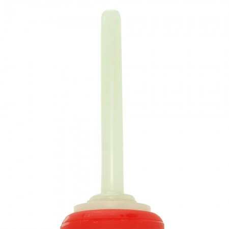Extra slim at the 2.5 inch (6.4cm) tip, the Douche nozzle screws securely to a soft red reservoir pump ball. Slip one of two water-tight O-rings over the base of the ball before affixing the nozzle- this step ensures a snug seal. Fill the ball valve beforehand or place the attached tip into a chosen cleansing fluid and squeeze to draw it into the reservoir.
