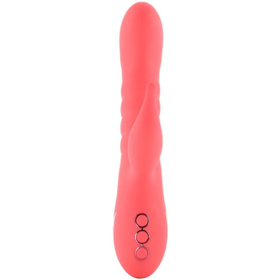Tipped forward up top, the Cutie penetrates smoothly, immediately seeking out internal erogenous zones. Once it’s in, get ready for some magic! That curvy shaft packs three speeds of up and down thrusting to complement ten more of throbbing pulsating stimulation from below. Those ten rhythms come courtesy of a up-titled tickler below- separate buttons activate and vary the tickler vibes and shaft thrusting.