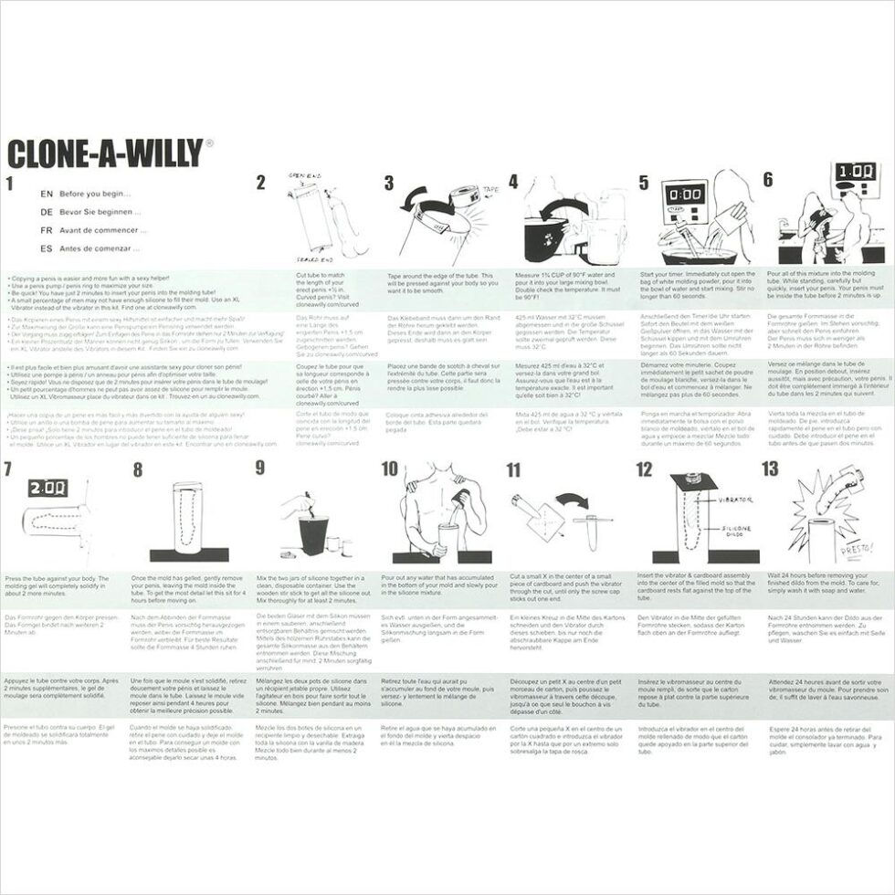 Once he’s out, you can start creating your vibe right away, or maybe you’ll want to make use of the real thing first; either way, when you’re ready, completely pour the combined contents of both jars of silicone mix into the mold. Next, position the vibe in the center of the filled mold and let it all set. What you’ll be left with an exact copy of your favourite cock with all details intact AND vibration that will make the whole thing buzz for your perfect pleasure. Make sure to follow the very detailed instructions for best results. The appearance of your Clone-A-Willy will vary, deeding on the size and shape of your man. Phthalate and latex free.