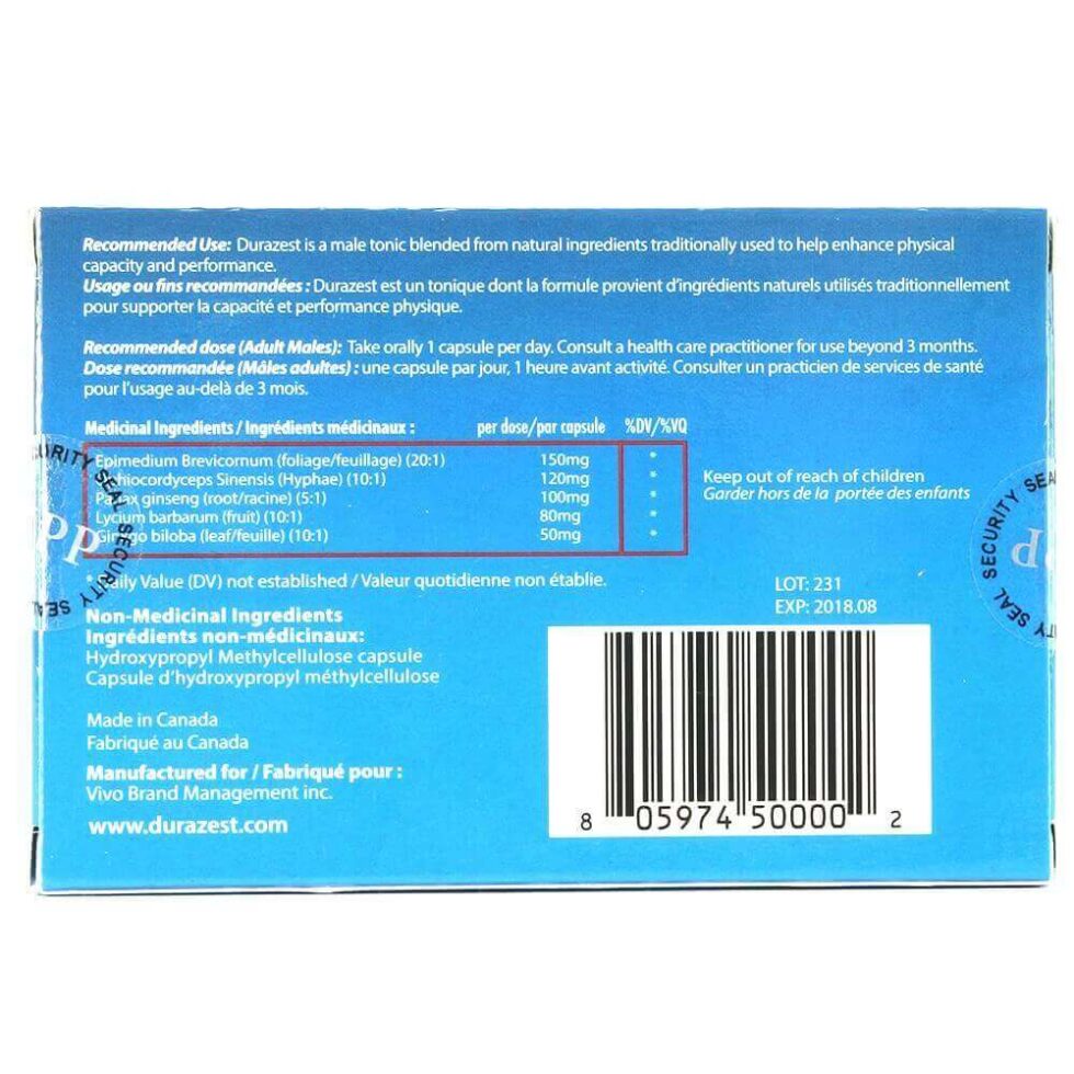 Created to help enhance male performance, increasing stamina and improving overall physical capacity, Durazest is a supplement combining natural ingredients used in traditional medicine. Take one capsule orally per day.